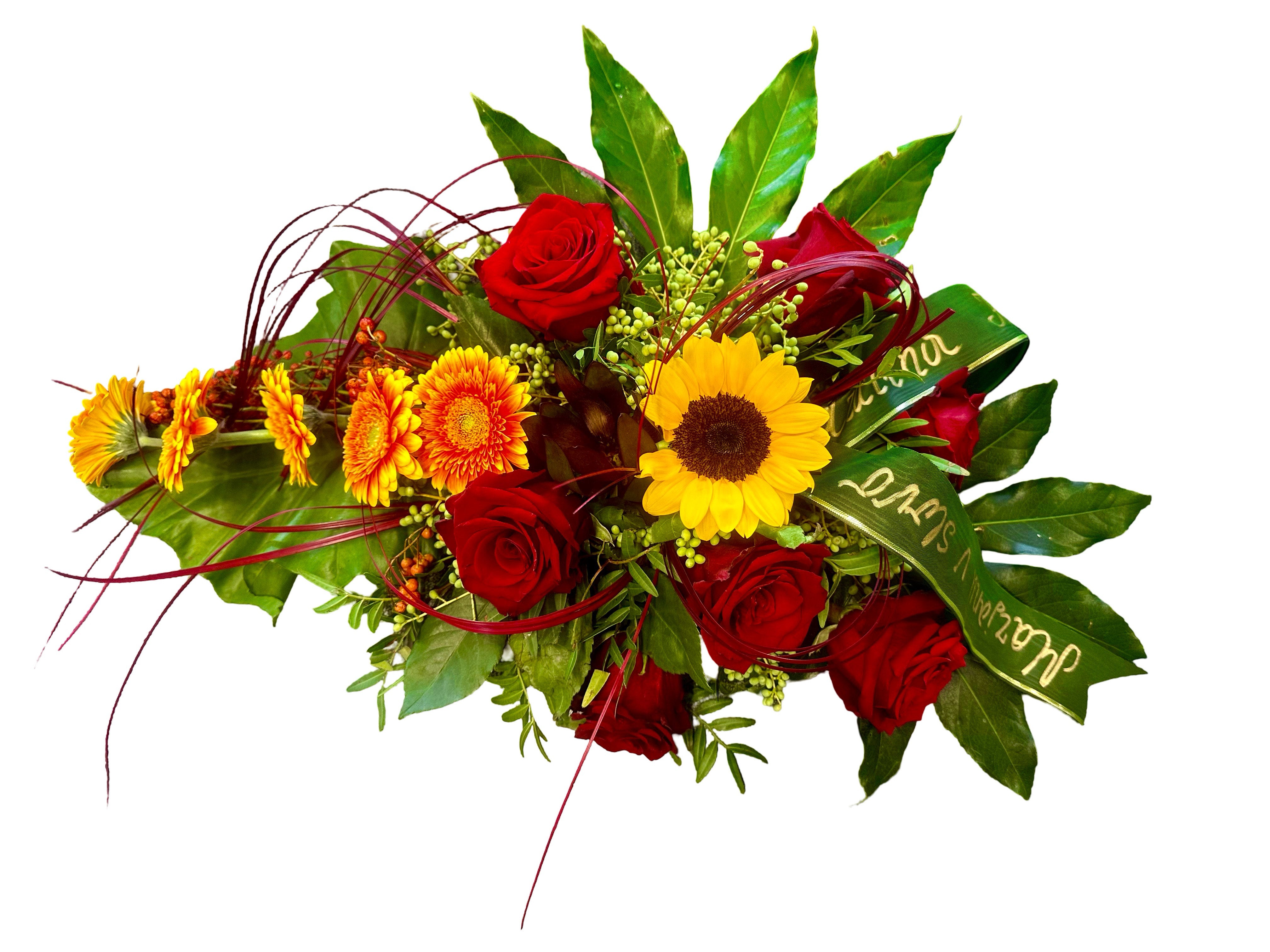 Ta eleganten pogrebni aranžma združuje toplino rdečih vrtnic, nežnost oranžnih gerber in svetlobo rumene sončnice, ki simbolizira spoštovanje, hvaležnost in večno ljubezen. Aranžma je skrbno oblikovan iz svežega cvetja in bogatega zelenja, kar mu daje plemenit in harmoničen videz.